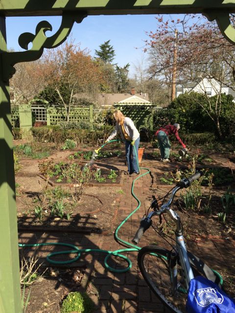 By this morning though, back in Salem, our intrepid Board president Bobbie Dolp was hard at work pruning the overgrown laurel hedges on the back alley…with help from Jay Raney…